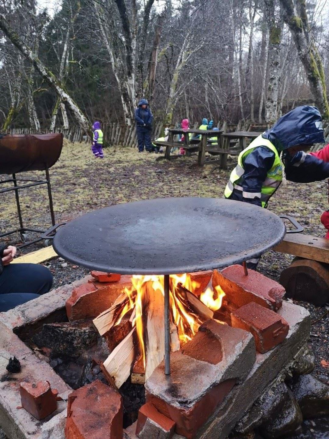 I øvste gata over barnehagen og rett under Aurenakken finn vi speidarhytta. Her er gapahukar, gamme og bålplass som vi får låne. Her kan vi gå i alt slags ver, og mat på bål er populært. Går vi over bekken og vidare opp i skogen kjem vi til ein fin granskog vi kallar Trollskogen. Her er hyttebygging av kvister og greiner populært.